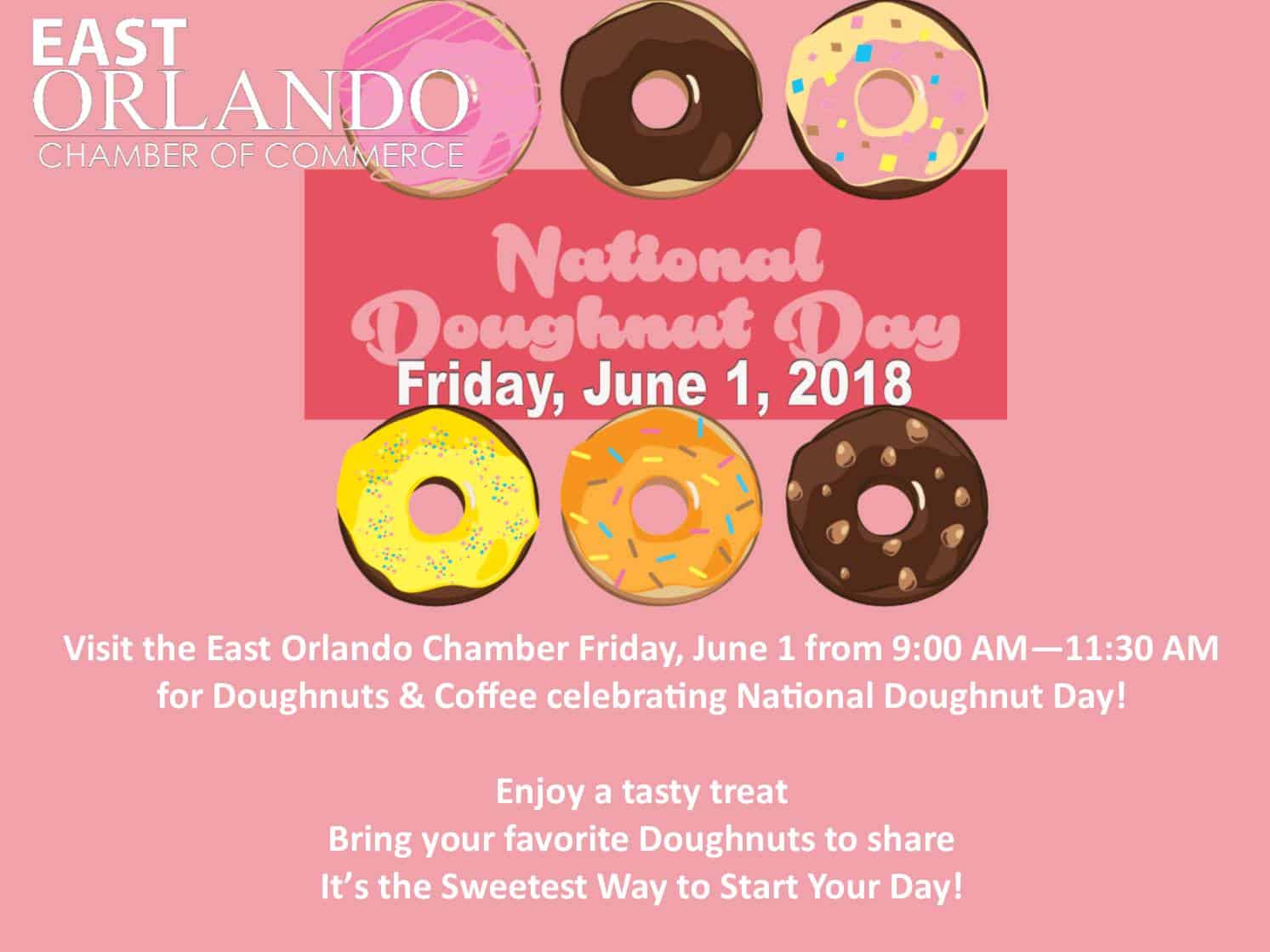 Visit the East Orlando Chamber of Commerce, Friday, June 1 from 9 AM – 11:30 AM for Doughnuts & Coffee celebrating National Doughnut Day!