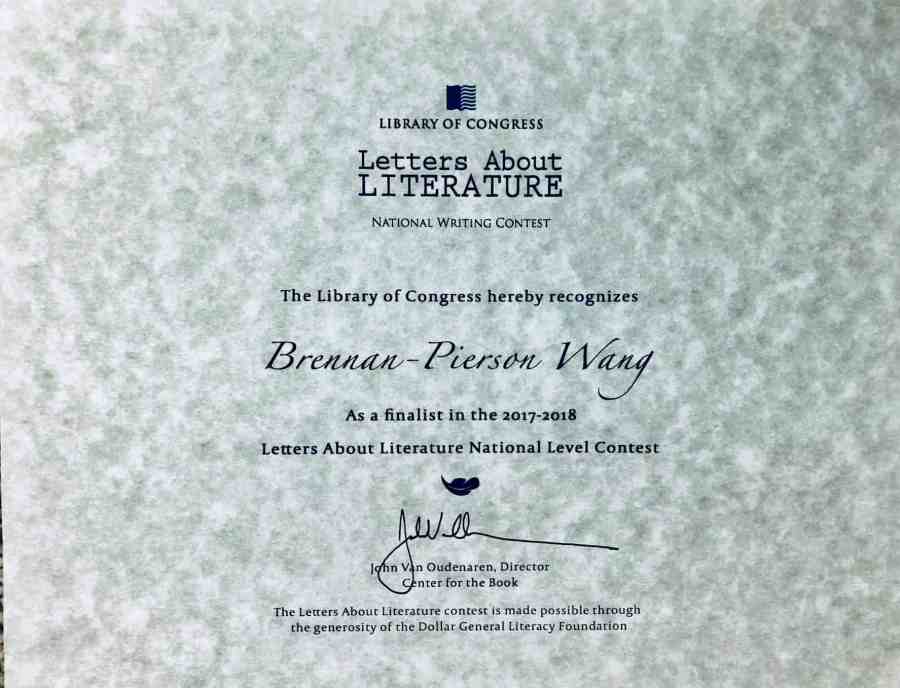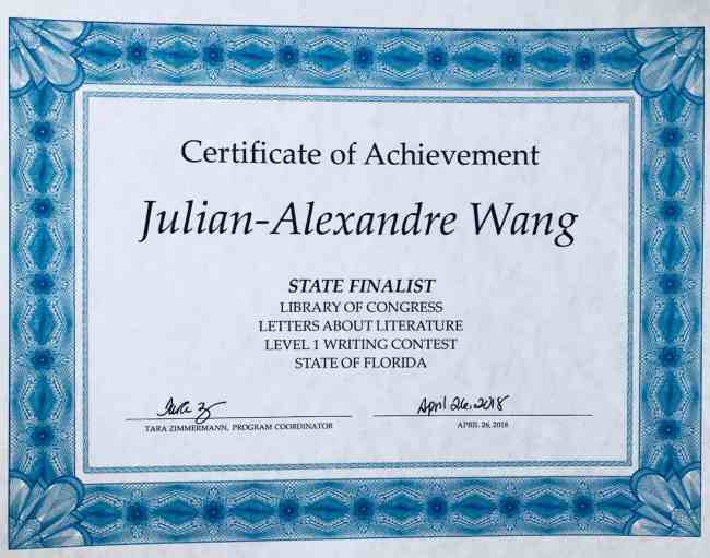 Brennan-Pierson Wang and Julian-Alexandre Wang have both diverse creativity and knowledge beyond their years. The brothers recently received recognition on their essays submitted to the Library of Congress in Washington, D.C., for a national writing contest called Letters About Literature. The essays crafted by the boys were not like regular book reports. The writing contest for students in grades 4-12 requires entrants to select a book, poem or speech and write a letter to the author highlighting how their lives were impacted or changed by reading their work. The Library of Congress encourages students to continue reading, exploring and understanding oneself and the world around them. Both boys made it to the semifinal rounds, with Brennan-Pierson Wang receiving first place for the state of Florida.