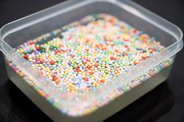 The experimentation has been endless. Sylvia’s favorite type of slime currently is fluffy slime. Fluffy slime feels like a squishy stress ball. She even funneled some into a balloon, which proved quite difficult. She’s also been testing additives. Rainbow pellets and styrofoam beads have both made their way into her slime with interesting results.