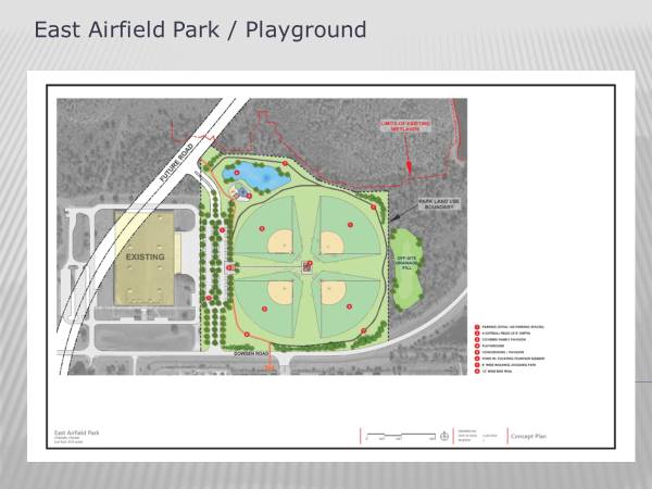 The East Airfield park will consist of 4 baseball/softball/little league fields with concession stands, an oversized playground, walking trail and a community garden. The park will be accessible from Dowden Road and be connected to the existing North Lake Park bike trail to provide safe and easy access for children and residents.