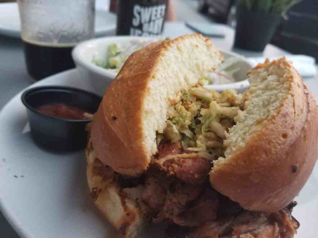 Our third stop was Nona Tap Room. We had a sort-of dilemma at this location because they have two pretty cool offerings, the black and bleu burger and the pulled pork burger. Since I (Matt) have had the B&B burger multiple times, we went with the pulled pork burger. Another delicious and savory burger went smoothly down the hatch. Not only did this burger have pulled pork on top, it also had the prettiest veggies and pretty nice presentation; they even split our house-made potato chips for two separate servings. Great burger, excellent presentation and service.