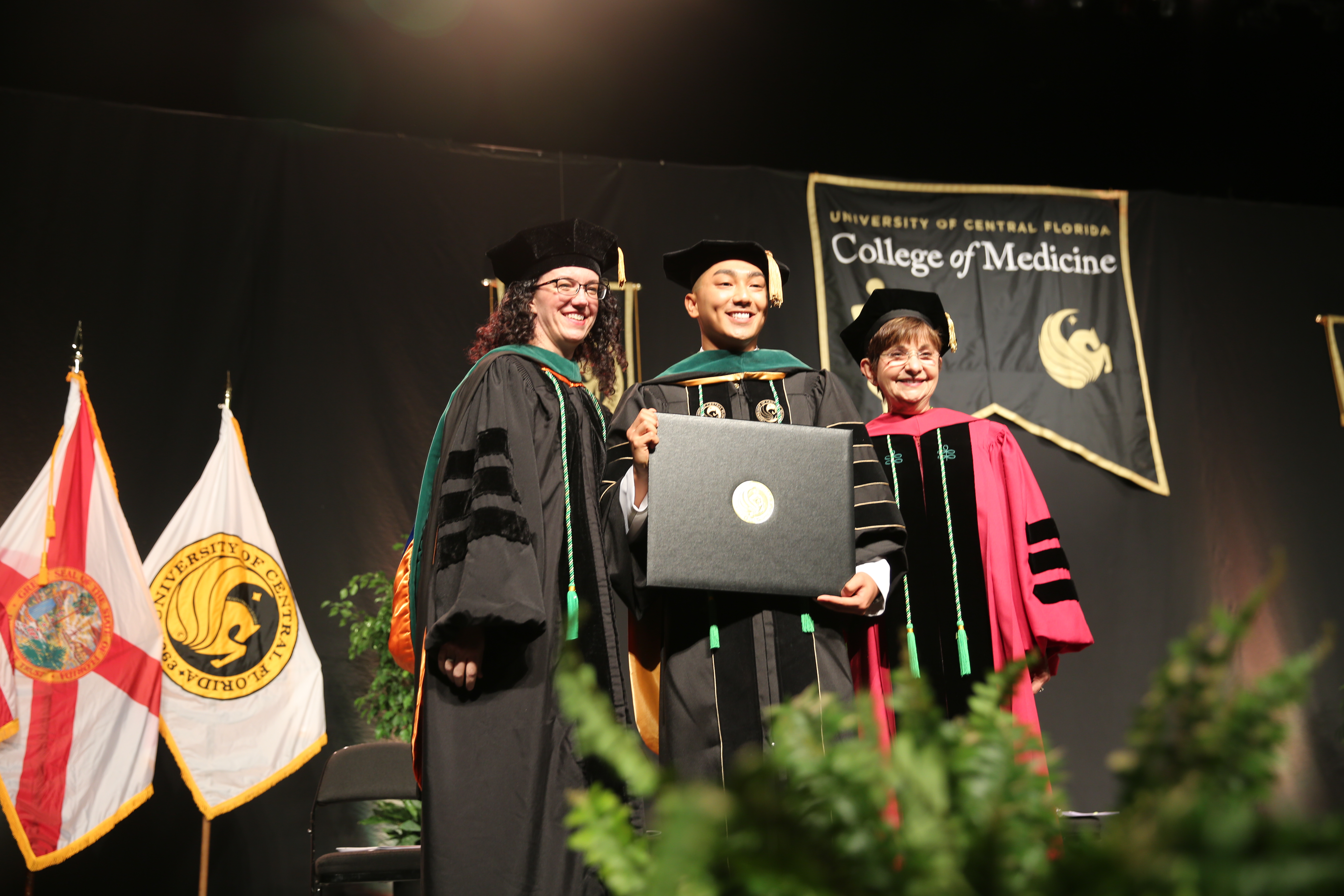 Jeremy Tran, also a “double Knight,” did cancer research as a UCF undergraduate and was selected for the Order of Pegasus – the university’s most prestigious student honor. As a medical student, he helped lead the student-run free KNIGHTS Clinic and earned the Florida Board of Medicine’s Chair’s Recognition Award as a future leader in the medical profession. A self-described “Navy brat,” Tran entered the military’s Health Professions Scholarship program, which covers tuition and living expenses for medical students who agree to serve their country for one year for each year of scholarship. So, in addition to graduating Friday, Tran received a military promotion along with four other medical school military officers. Now he’s off to Walter Reed National Military Medical Center in Bethesda, Md., where he will train in orthopedic surgery.