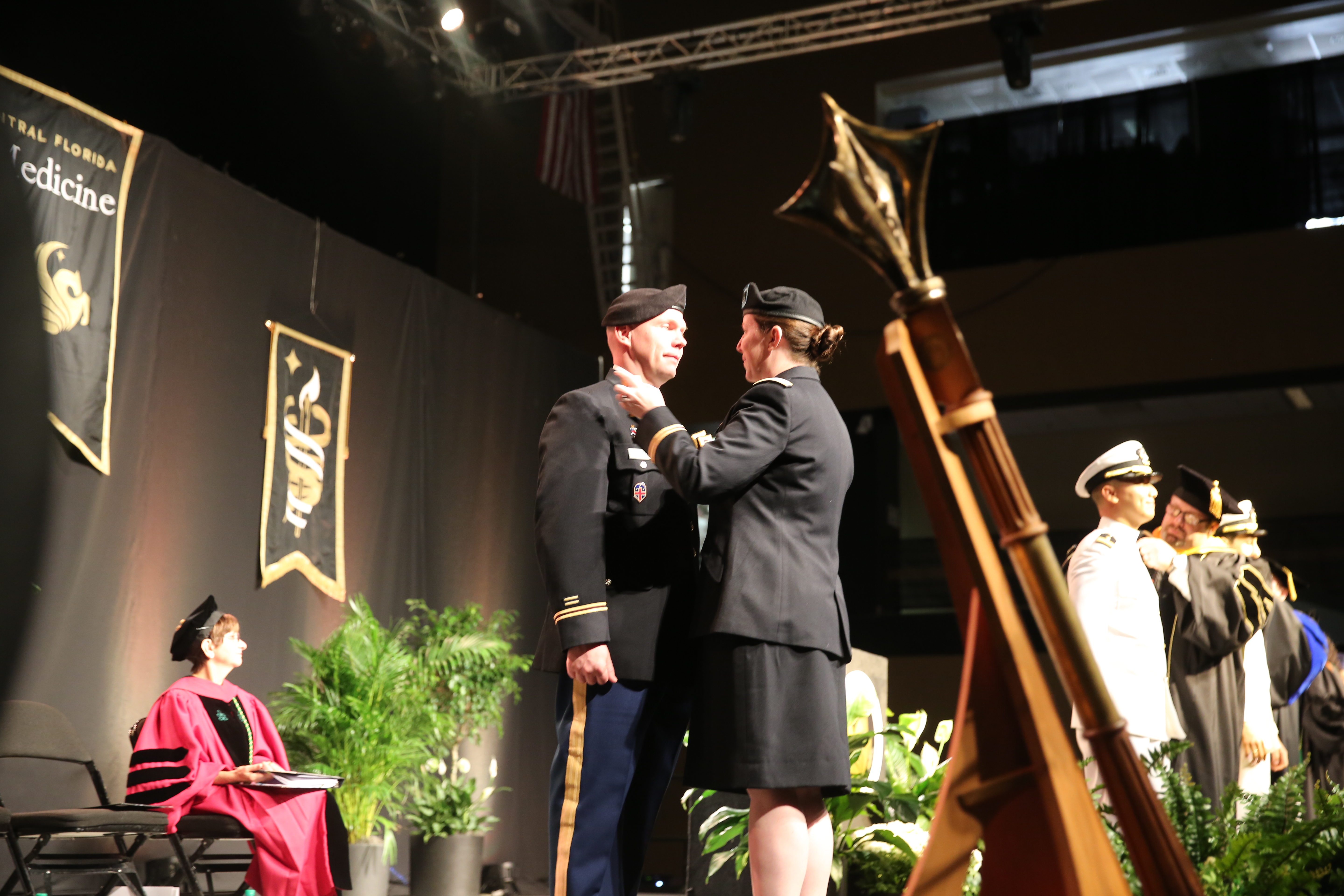 UCF double Knight Arron Smith served in Iraq as an Army nurse and met his future wife, Melissa, there – she was also an Army nurse. They earned their nursing degrees at UCF, worked as nurses, and then decided to pursue medical school. Dr. Melissa Smith graduated in the Class of 2018. This year, dressed in full military uniform, she pinned her husband with his new military rank after he received his M.D. diploma. Arron will join his wife in residency training at Madigan Army Medical Center in Washington state. “It’s exhilarating for both of us to be part of the UCF legacy,” he said.